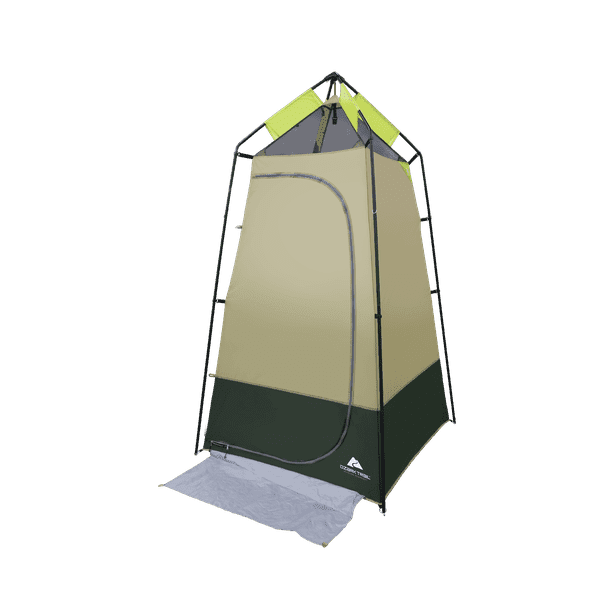 Whether you're washing off the grit or switching pants, the Hazel Creek Lighted Shower Tent completes your campsite bathing and changing needs. The durable steel frame and hanging hook can hold 50 pounds of water, plus there's a PE floor with mesh drainage ports for your washing needs. Assembly is easy with all poles connecting to one hub. A gear loft includes a pocket for an included LED light; and for airflow, the roof is a mesh panel and there's a zippered rear window. Storage is simple using the mesh pocket, hanging two-tier shelf, and webbing hoops so you can hang items. An integrated mud mat gives you a place to keep your clothes and belongings out of the dirt and mud. 1 Person, 1 Room, Green